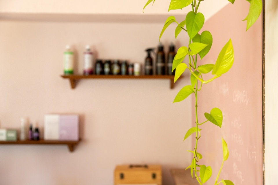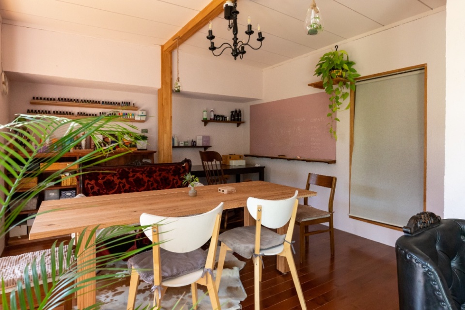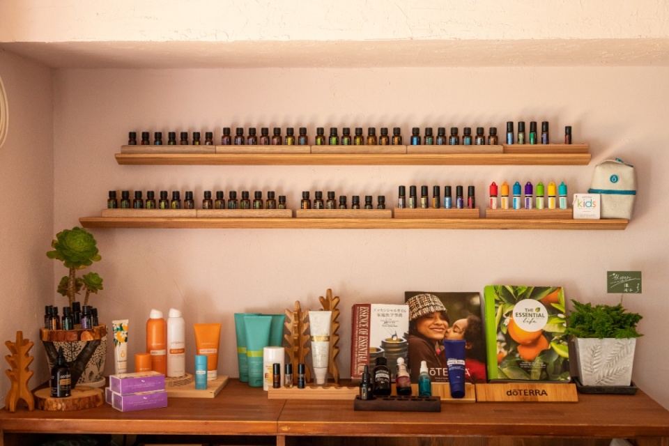 テーブル・スペースの壁面にはたくさんのアロマオイルが飾られています。