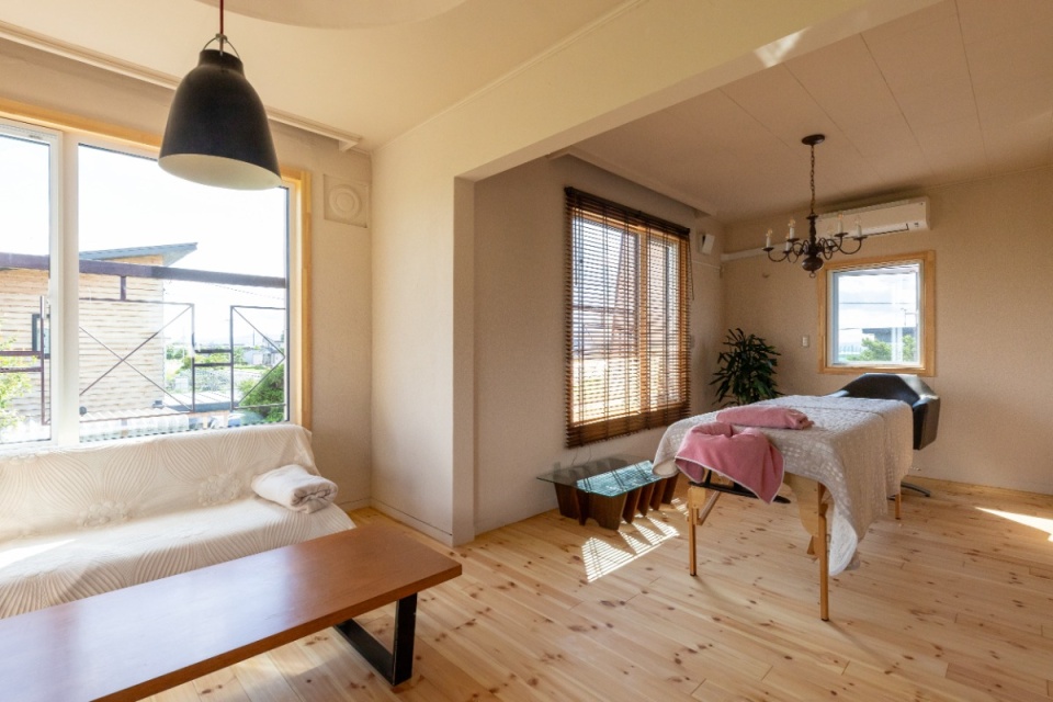 2階には奥さまがアロマテラピーの施術を行う施術室が用意されていました。手前には座ってくつろげるソファー・コーナーもあります。
