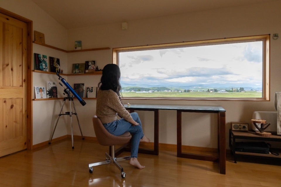 奥さま 大雪山系がよく見えるよう、窓を大きくとってほしいと希望しました。窓から景色を眺めながら、季節の移ろいを感じられる暮らしが気に入っています。