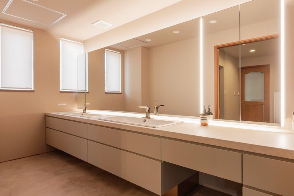 「2つの洗面ボウルは夫婦で分けて使っています。照明も明るく、雰囲気があっていいですね」