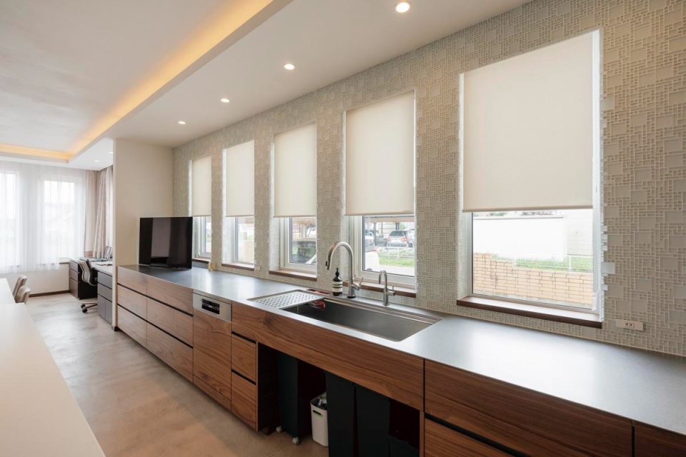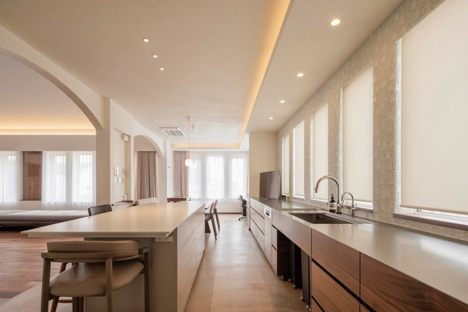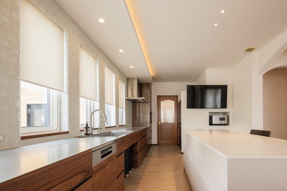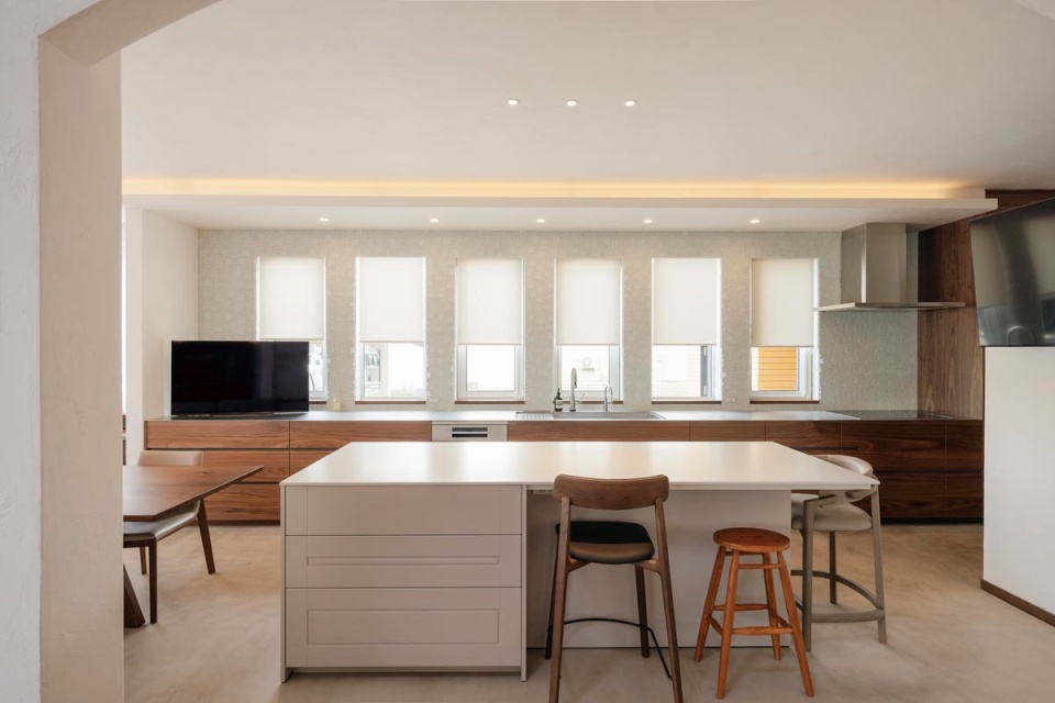 kitchenhouseのフルオーダーキッチンは、吉田社長と一緒に札幌のショールームまで行きプランニングしました。広島から職人が来て仕上げたというワークトップの長さは7.2m。家具のようにも感じられる木製の面材とゆとりのある空間づかいで、落ち着きのある印象になっています。