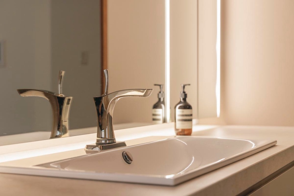 「洗面ボウルはフラットで薄く、面積の広いものが良かったんです。色々探してもらってこれにたどり着きました」という洗面ボウルはKALDEWEI社、水栓はDELTA社の輸入品。選び抜いたものだけで造った品のある空間になりました。