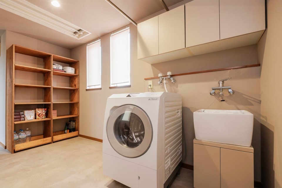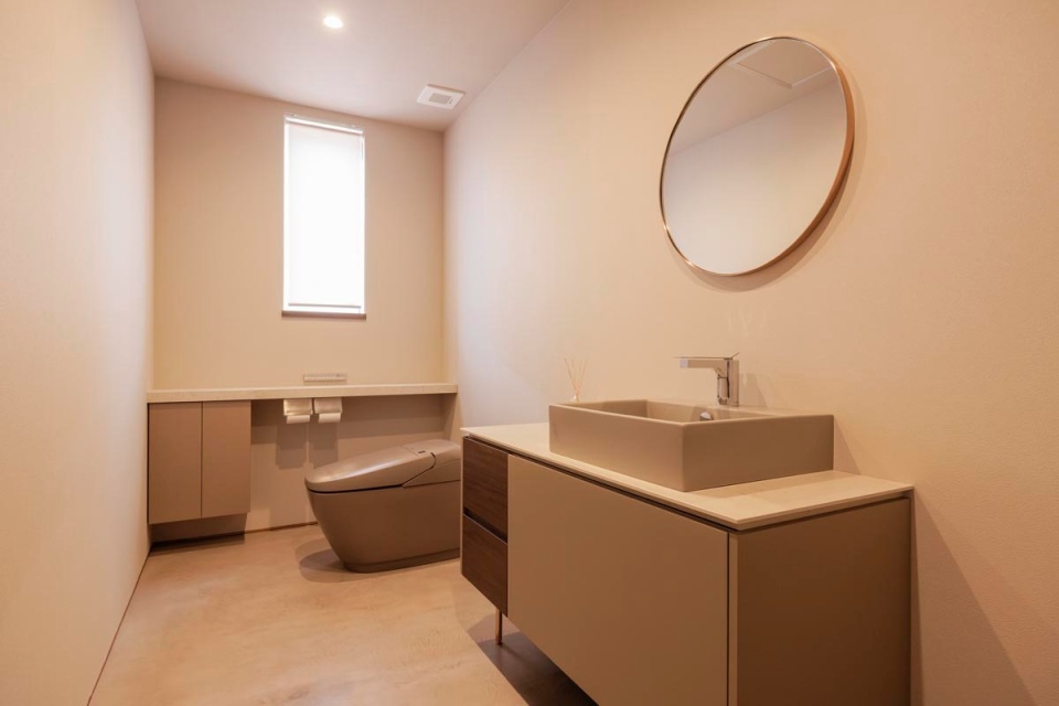 洗面所は、洗面台・鏡ともにオリジナルで造作しました。天板は傷に強くメンテナンス性に優れたセラミック製。鏡の中は収納になっています。