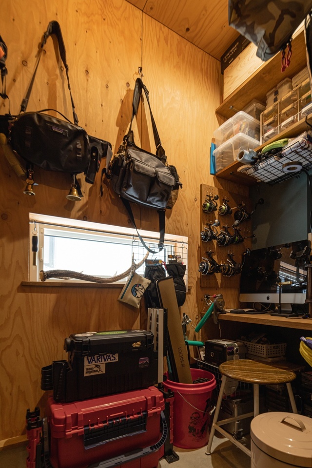 釣り部屋には毛ばり作りやリールの修理ができるカウンターもあります。釣り部屋から直接ガレージへ出られる間取りで、夜釣りに行くことも多いというご主人は、家族を起こさずに出かけることができるので便利だと満足の様子です。