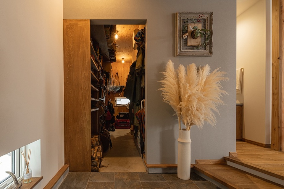 玄関の土間収納はウォークスルータイプにして、アウトドアや釣りの道具を収納するスペースに。その先に「釣り部屋」を配置しました。