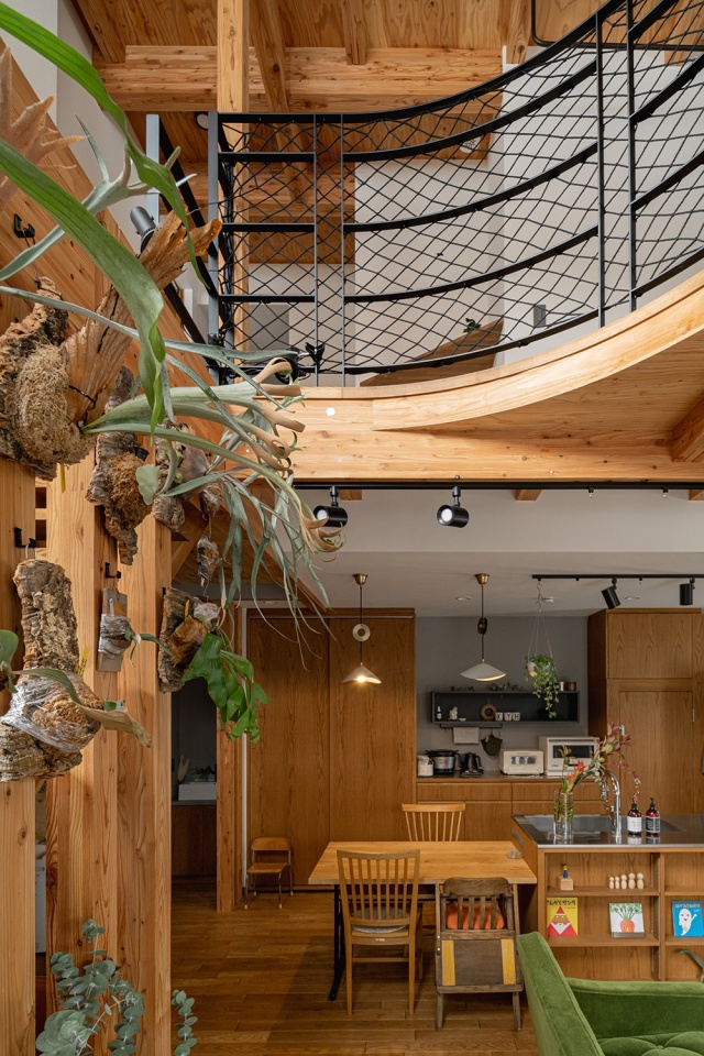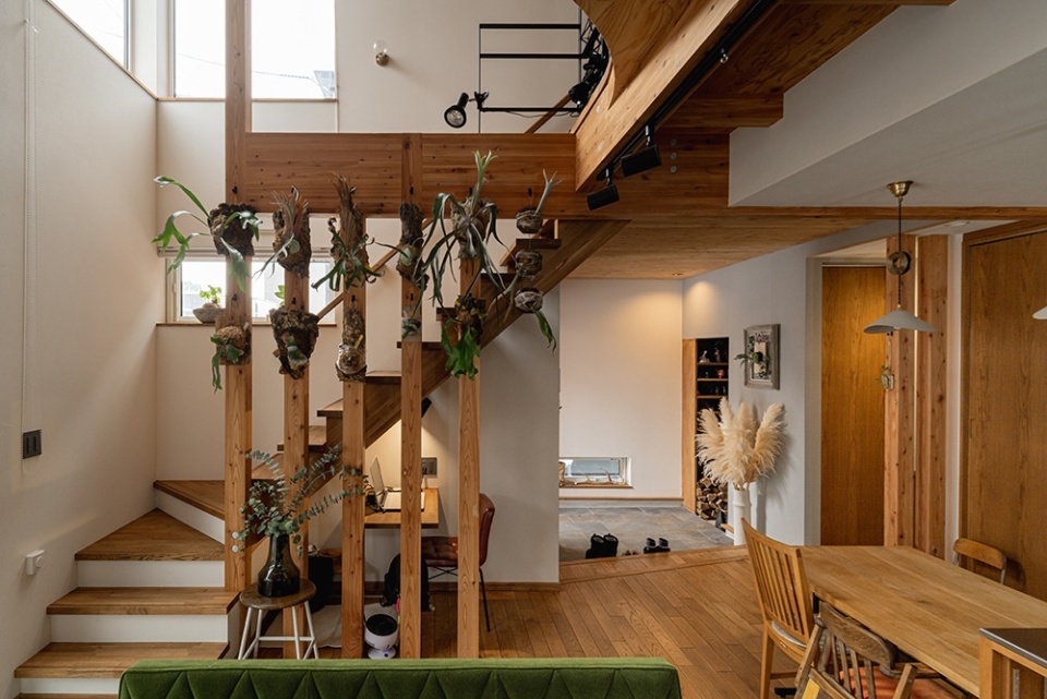 白い壁と木材をバランス良く配し、手すりや照明器具などに取り入れた鉄素材が空間を引き締めています。ご主人が選んだ壁掛けの観葉植物も良い雰囲気です。