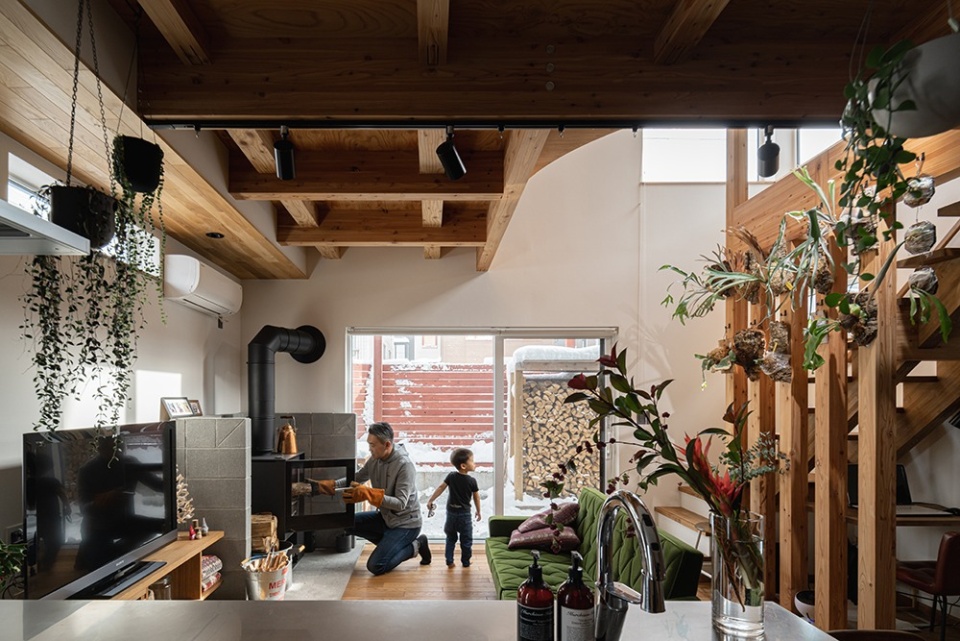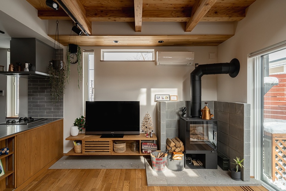 リビングの角に置かれた薪ストーブは、2018年の胆振東部地震で大停電を経験し、電力に頼らない暖房が必要だと感じたことから設置しました。