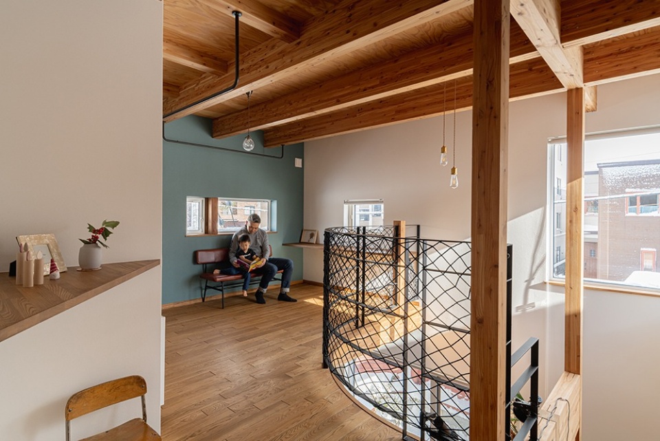 リビングの階段を上がった先にあるフリースペースは「将来的にカフェのように使えたら」というイメージでつくられました。ソファに座った時に公園の緑が見える位置に窓が付けられています。薪ストーブの真上にあり、冬はストーブを焚いていると床暖房のように暖かくなってさらにいごこちのいい場所になるそう。