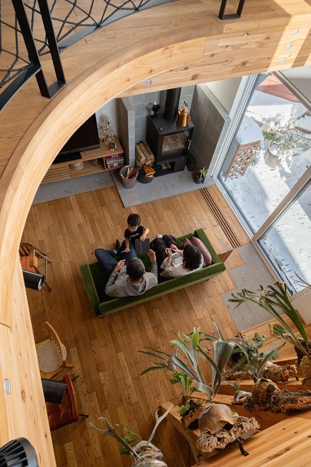 北向きのリビングは、2階の南向き窓から吹き抜け越しに陽が差し込み、やわらかな光に包まれています。吹き抜けは「曲線をどこかに入れて室内の印象をやわらかくしたい」というご夫婦の希望を反映したカーブを描くデザインに。
