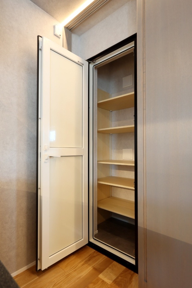 背面収納には大型の食品庫も設置されています。冬季は冷たい外気を取り入れて保冷庫となります。