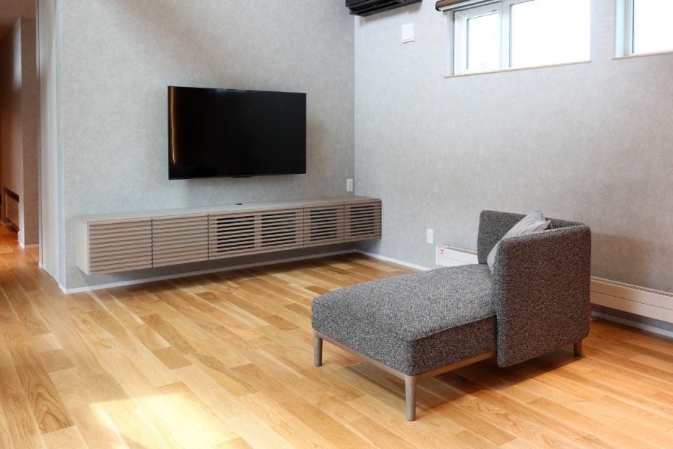 造作のテレビボードは植物油から作られた天然塗料のオスモカラーで仕上げました。ソファもグレーカラーであわせました。