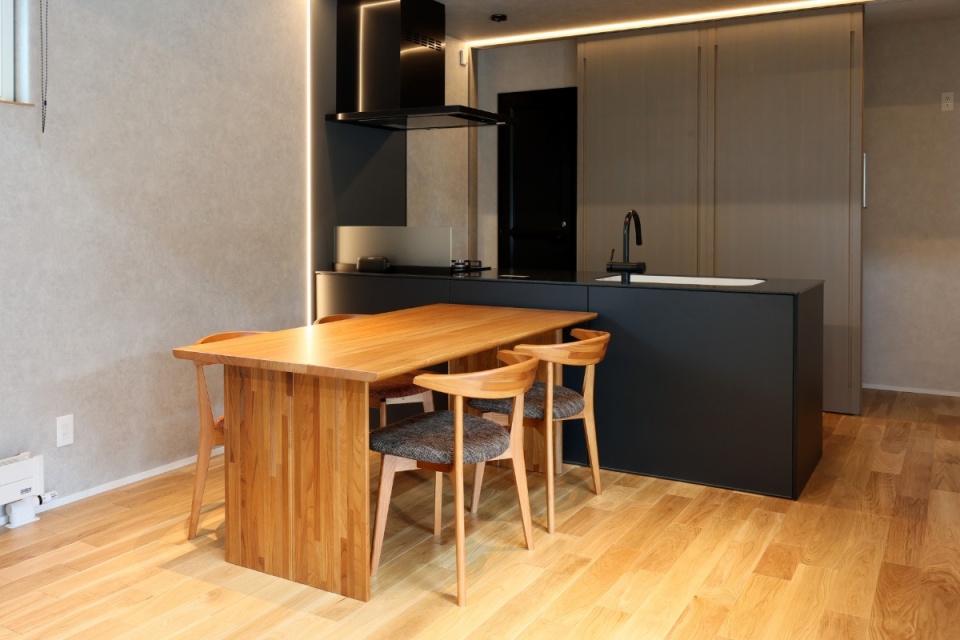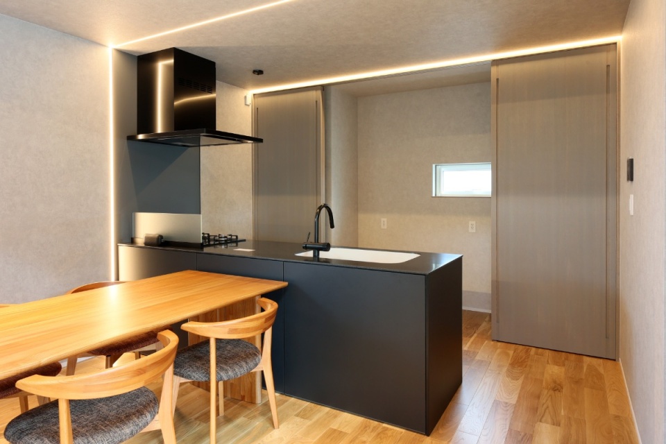 ダークカラーで高級感のあるキッチン。キッチンとダイニングの境に配されたLEDのライン照明がクールで洗練された印象です。