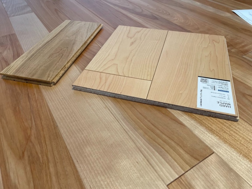 左は昭和木材オリジナルの厚さ15mmの無垢板フローリング、右は板を貼り合わせた合板フロアパネルです。全て東川町で加工されている昭和木材オリジナルのフローリングは冬場の乾燥に強く縮みにくい高品質。シンプル・モダンな空間が、1枚板から削り出される木目の美しさを際立たせています。