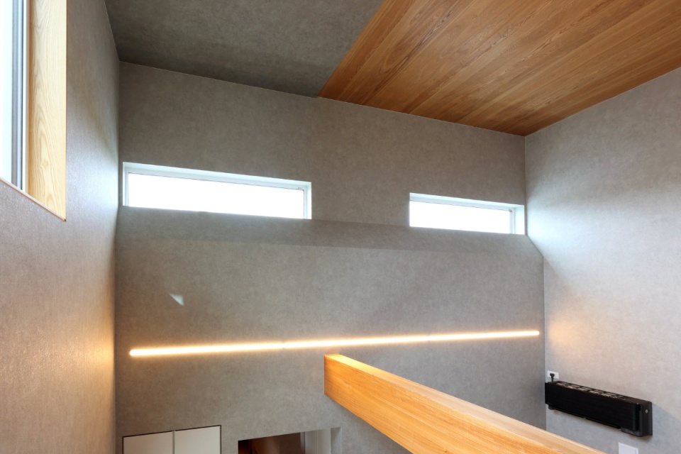 髙野さん 吹き抜け窓からの採光にもこだわりました。窓の下の壁は斜めにカットしたデザインにしており、時間によってはキレイなライン状に光が差し込みます。