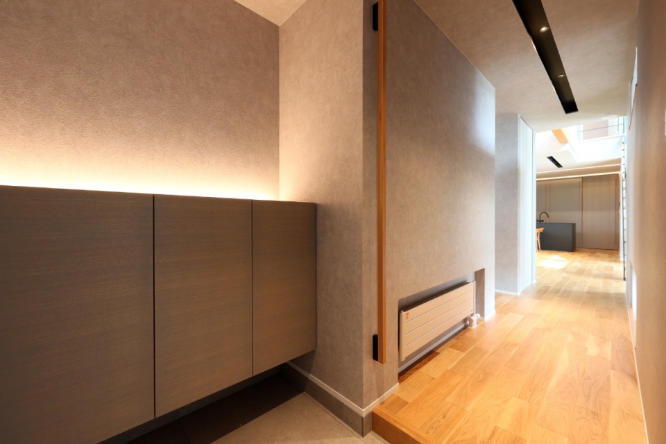 髙野さん リビングに出た時に吹抜をより高く、空間をより広く感じられるよう、玄関の廊下は通常よりも天井高を低くしています。