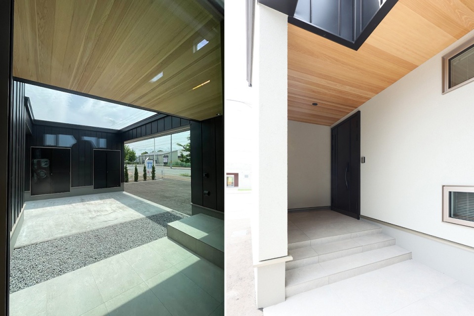 髙野さん 正面の塗り壁を回り込んだところに玄関を配置しています。玄関アプローチを作ることで通りからの視線を自然に遮り、公園側から吹く強い風をかわして出入りがしやすくなるよう設計しました。