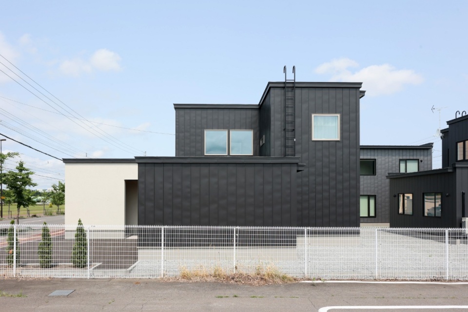 外観はダークカラーのガルバリウムとホワイトの塗り壁でスタイリッシュな佇まい。大きな通りやコンビニエンスストアに隣接することから、プライバシーを確保するための工夫が見られます。