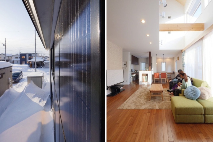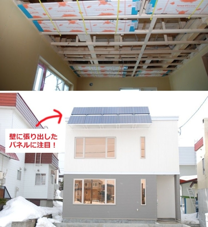写真はその住宅ですが、パネルの設置方法も独特です。よく見かける、無落雪屋根の上に架台を組んで設置した5kw相当の太陽光パネルに加え、佐藤社長は、まるで軒のように張り出すような形で、さらに5kw相当の太陽光パネルも設置しています。