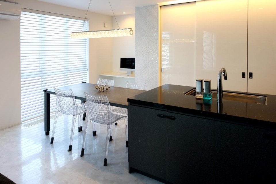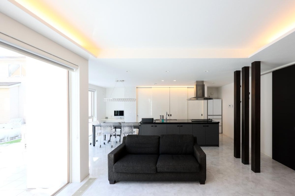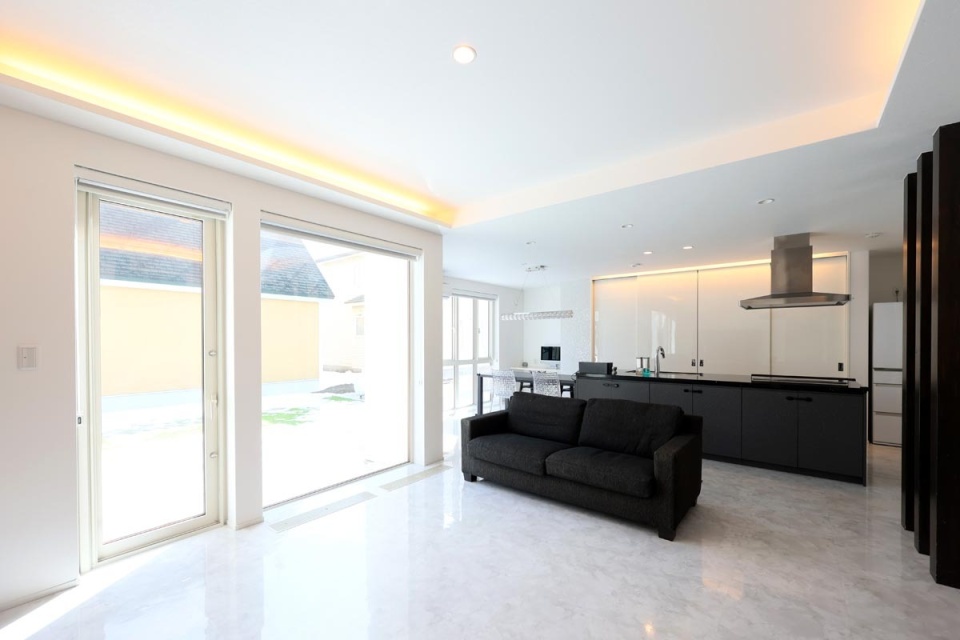 LDKは26.25帖。大理石調のフロアタイルや、白で統一された内装材などがホテルのような印象を与えています。