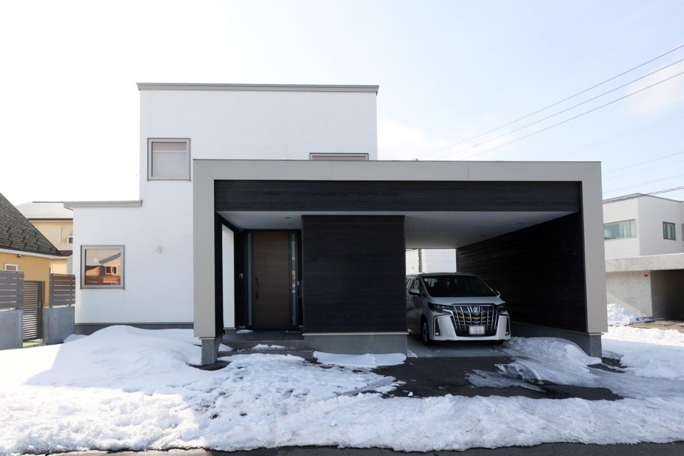 家全体のデザインコンセプトは「モダン」。夫婦で話し合うなかで、木材が前面に出る「ナチュラル」より、白を主体としたシンプルなデザインを要望しました。玄関横のカーポートは、特殊な敷地形状を活かして、裏側から直進して入庫し、前進して出庫できるようにしました。