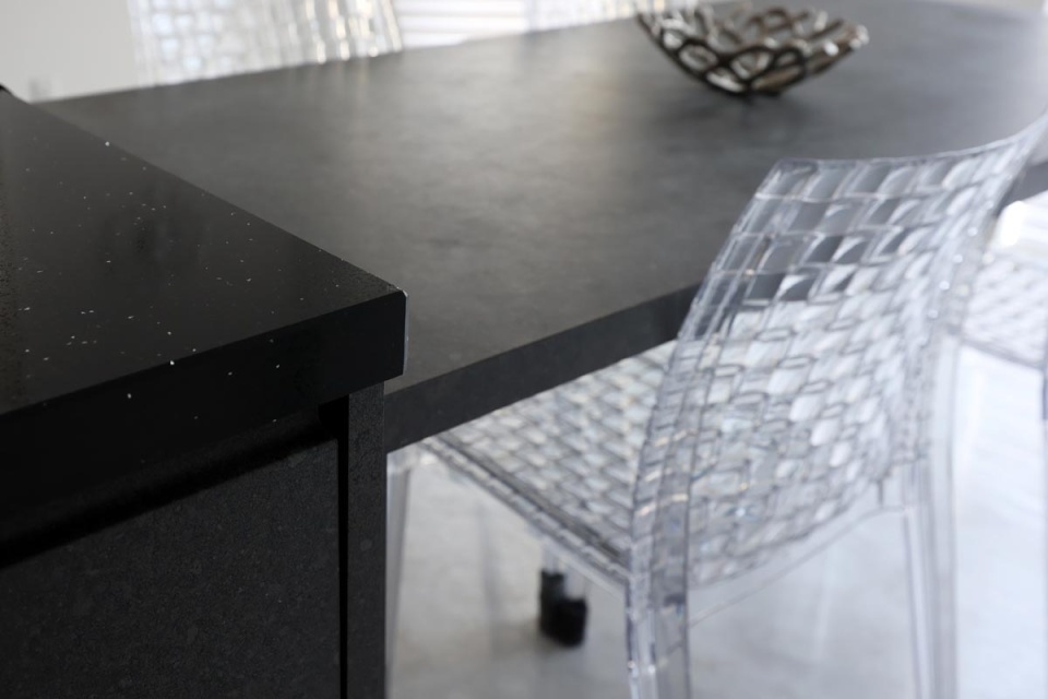 キッチン周辺がすっきりした印象なのは、キッチン背面全体が大きな造作収納で、食器や炊飯器などが収納できるためです。また、キッチンとダイニングテーブルの面材を揃えることで統一感を高めています。