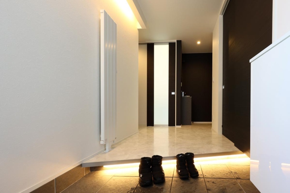 「土間続きのシューズクローゼット、そして玄関ホールの正面には手洗い器も設置したので子どもたちが手を洗ってから室内に入れるのも良かったですね」と奥さま。