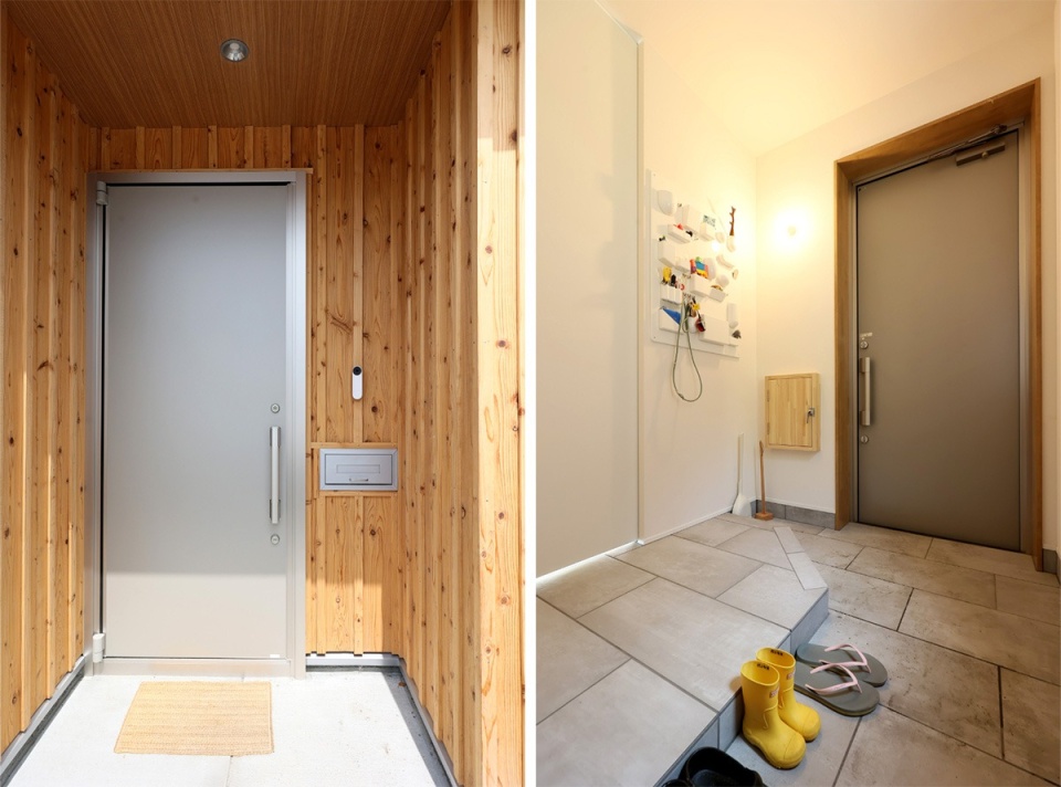 板張りの玄関ポーチ。ドアを開けると、土間とホールの両方に石目調タイルを施したシンプルな玄関が現れます。ウーテンシロの隠さず見せる収納は、使い勝手も良いそう。