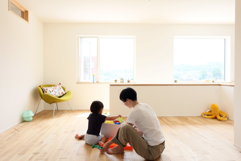 見晴らしの良い2階フリースペース。眺望の良さを確保するため、階段の仕切り壁を窓台の高さに揃えています。