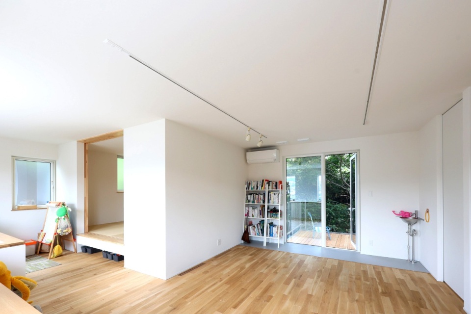 M邸の大きな特徴は、仕事や家事にまつわるワークスペースをまとめた1階と、和室、寝室などのリラックススペースをまとめた2階でゾーニングしている点です。寝室以外は個室を作らず、部屋の用途を限定しない可変性の高い設計です。