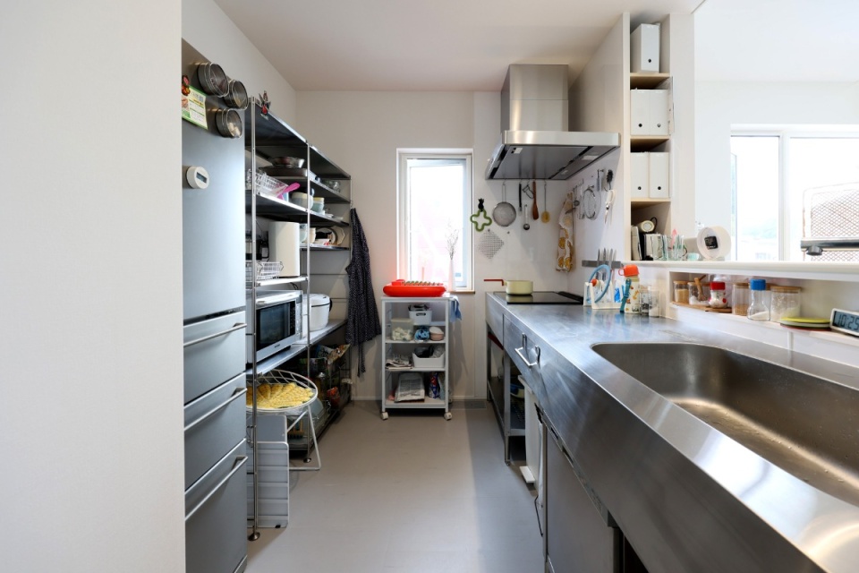 キッチンの冷蔵庫や収納ラックは無印良品、ステンレスのシステムキッチンはサンワカンパニー製です。