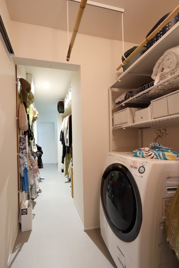 奥さま 仕事場でもあるリビングの仕切り壁の裏には、洗面所とトイレ、洗濯機や物干しができるユーティリティーとクローゼット、浴室を、一直線に配しました。洗濯が済んだら天井から吊り下げた物干しで乾かし、ハンガーにかけたままクローゼットへ収納できる便利な動線です。