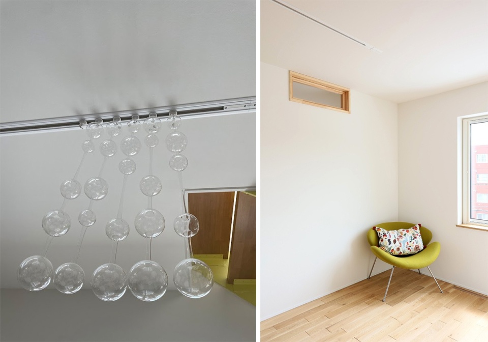左/リビングの天井で揺れる、イッタラの「アテネの朝」。中古店で見つけた掘り出し物です。右/階段上のコーナーに置かれたピエール・ポーリンデザインのオレンジスライスチェア。
