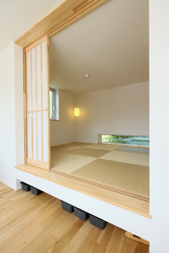 小上がり風の和室。足元にはA4サイズのボックスが収まる奥行きを作りました。地窓やアオヤの手すき和紙ランプが良い雰囲気。