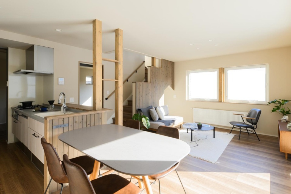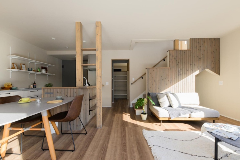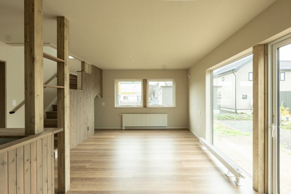 リヴスタイルは、北海道産の自然素材を使った家づくりで定評のある三五工務店のグループ会社で、三五工務店の設計士と社員大工・専属大工がリヴスタイルの家づくりに直接携わっています。このモデルハウスでは、これまで以上に木の素材感が味わえるデザインを採用しました。