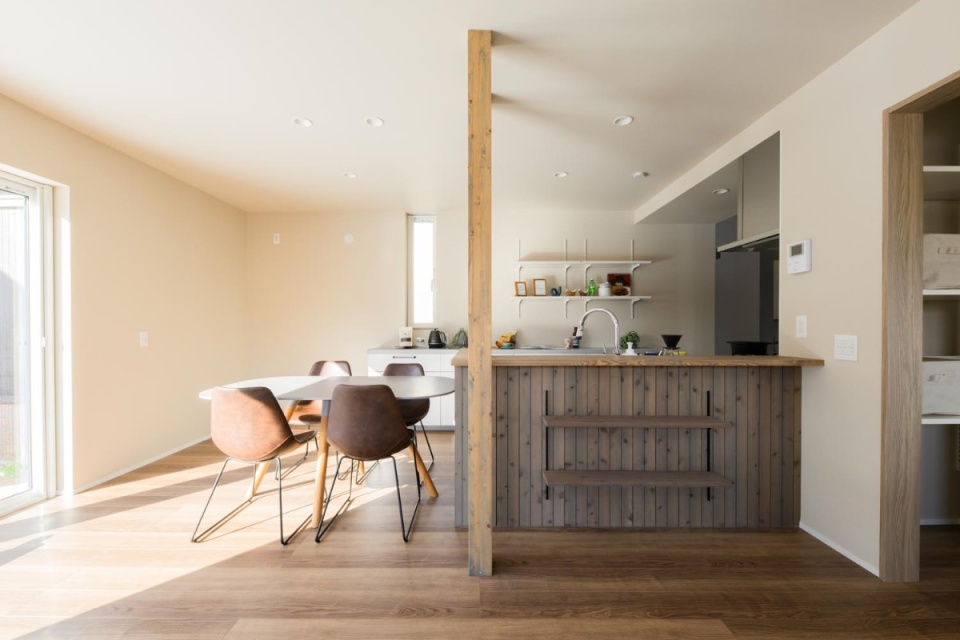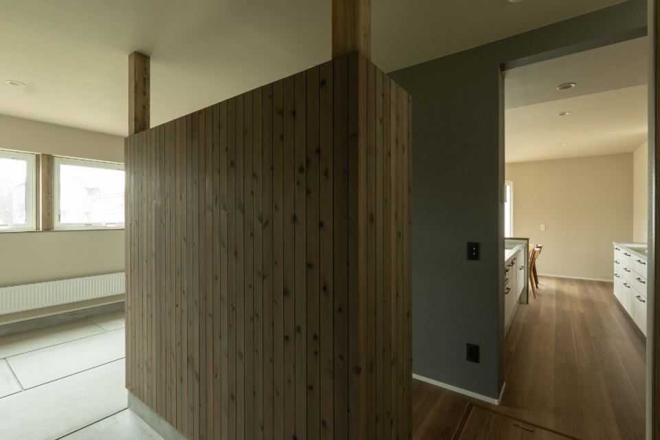 キッチンの腰壁やリビングの壁面の一部には、道南杉を使用。存在感のある羽目板のおかげで、木の温もりをたっぷり感じられるLDKに仕上がっています。