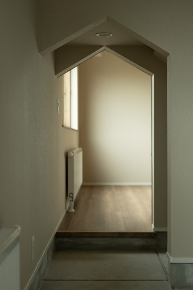 階段下のデッドスペースをくり抜き、リビングと土間スペースをつなげました。まるで秘密基地のような趣です。開口部上の三角形が愛らしいアイキャッチとなっています。