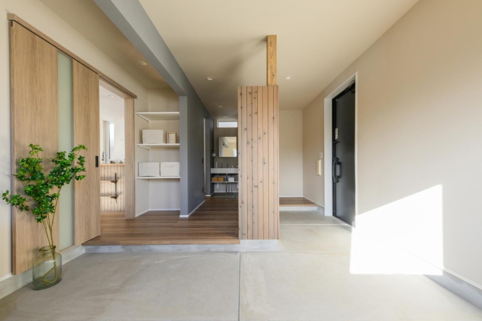 玄関を入ると、「LIV+DOMA」の名の通り、広々とした玄関土間が。土間スペースだけで6帖分あります。