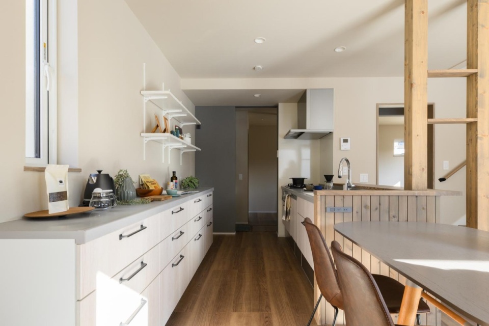 キッチンはパナソニック社製で、背面のカウンター棚の収納力も抜群。さらに可動式の飾り棚もあり、ゆとりの広さが魅力です。