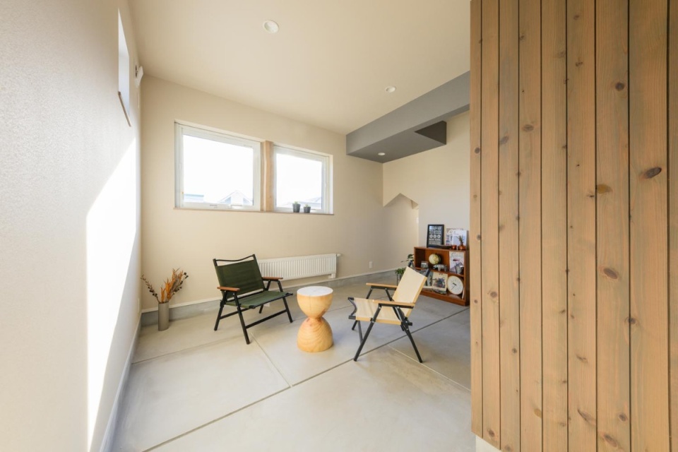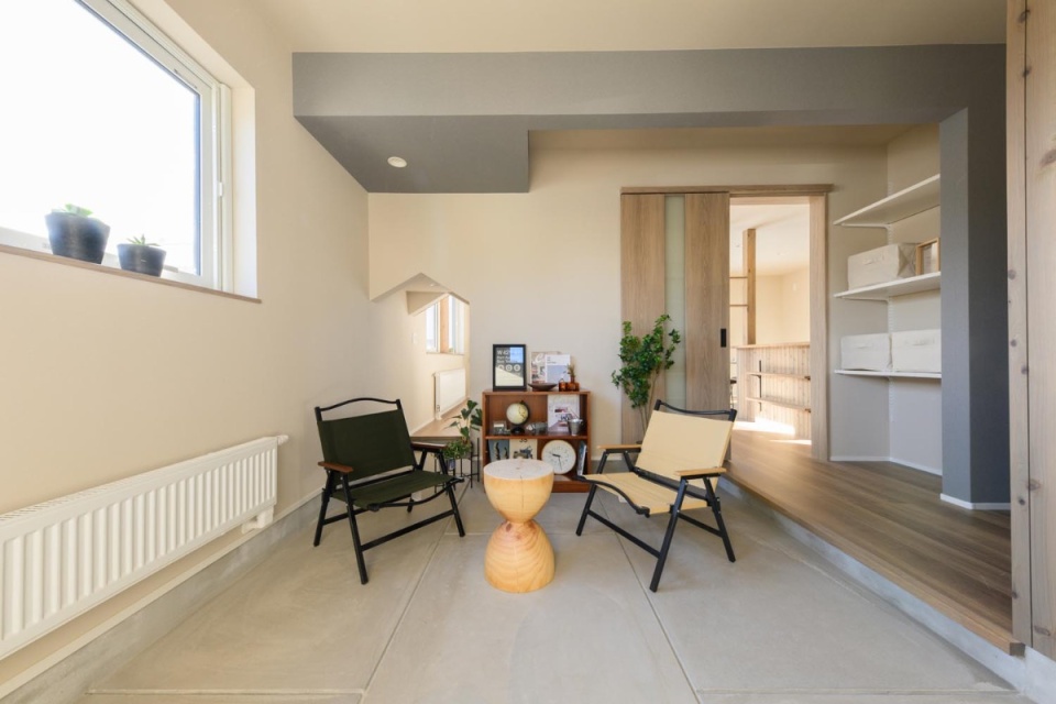 たとえば自転車やアウトドアが趣味の方なら、ここにギアを飾りながら置いたり、メンテナンススペースにできたり。犬と暮らすファミリーなら、愛犬のお気に入りスペースも作れそうです。仕切りを設けてセカンドリビングとして使うこともできます。