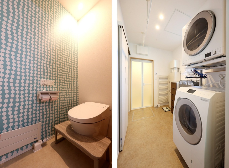 左/トイレは北欧風のかわいらしいクロスで明るい空間に。
