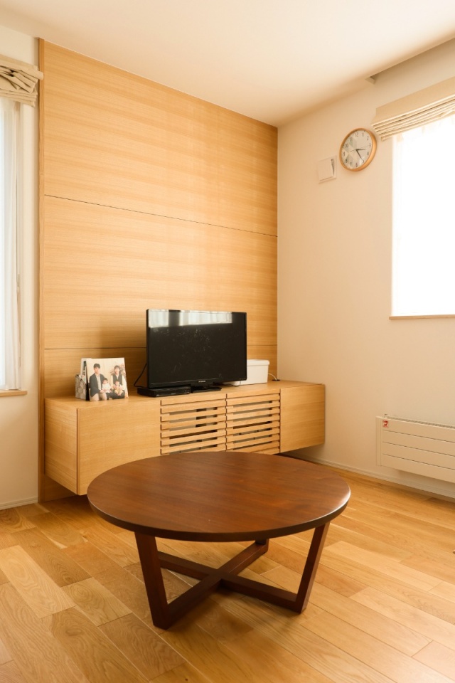 ウォールナットの丸い天板がかわいらしいコーヒーテーブルは林さんのデザインです。テレビ背面の突板にはタモの無垢材が使われており、部屋全体に木の温もりを感じます。