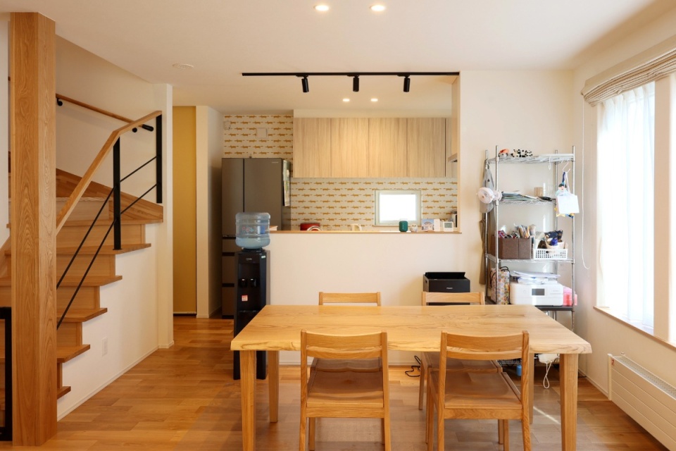 キッチンからは1階全体が見渡せる造り。階段を行き来する家族の様子も見渡せます。