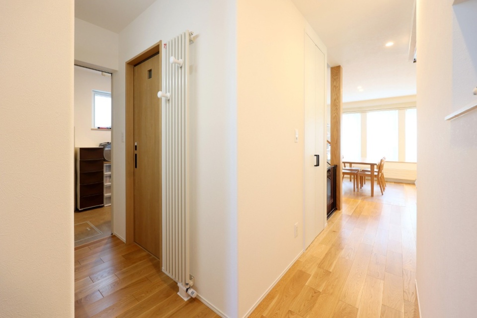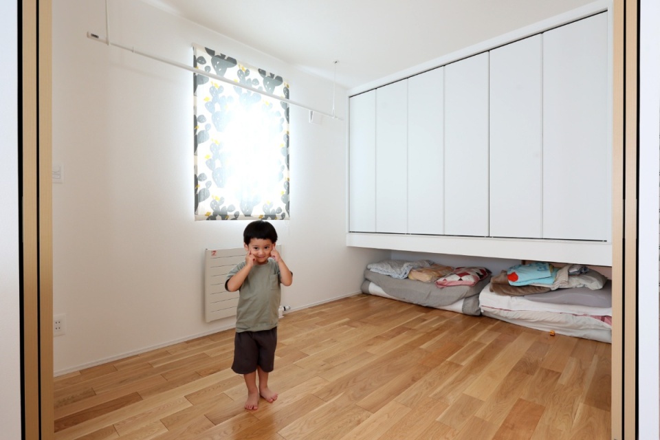 寝室の隣には4帖の納戸をつくりました。お子さんが自分のタイミングで入れるよう、ホールから出入りする動線にしています。収納スペースを分散させず、1箇所に集めることで、大きなスペースを確保することができました。
