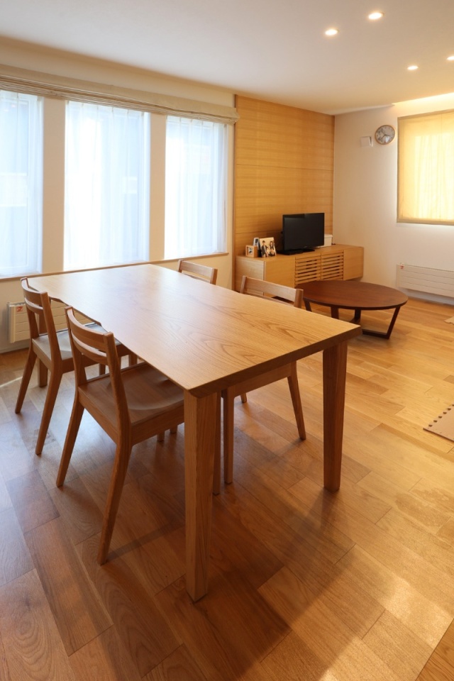 17帖のリビング・ダイニングは、客室を合わせると22.5帖と、広々とした空間です。ダイニングテーブルとコーヒーテーブル、テレビボードは昭和木材のオリジナル。高品質でデザインもよく、永く愛用できる造作家具が手に入るのは、昭和木材ならではの魅力です。