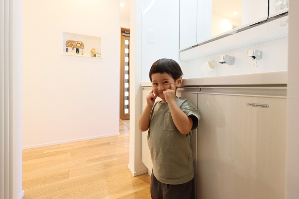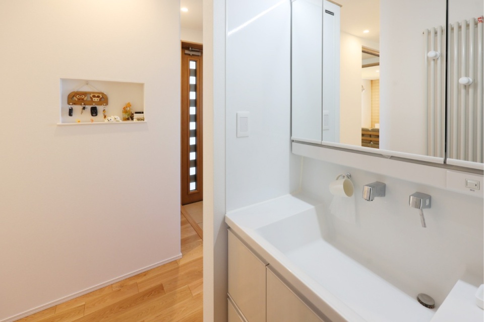 帰宅後の手洗いや、来客にも使ってもらいやすいよう、洗面化粧台は玄関からユーティリティーに抜ける通路に設置しました。