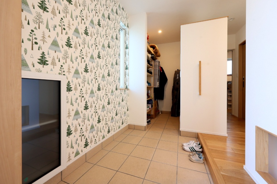 木々の柄が可愛らしい玄関。玄関には宅配ボックスを備えています。玄関の広さは2.5帖ですが、奥のシューズクロークが1.3帖あるため、奥まで見通せて空間にゆとりを感じます。