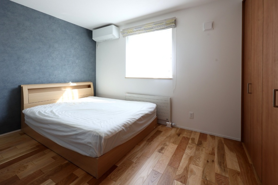 主寝室の無垢床は、色味の違いが楽しめるよう、板の組み合わせを工夫しています。