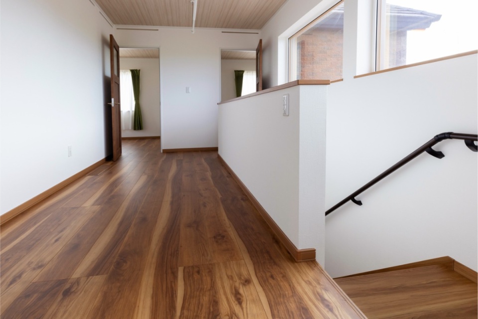 2階の広いホールは物干し場として活用しています。遮るものがなく見晴らしがよい南向きの窓からは、陽射しがよく入ります。