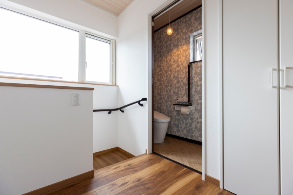 2階トイレにはシックな色合いのアクセントクロスが。壁紙やドアの色、照明はすべて奥さまが選びました。
