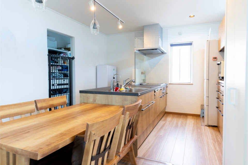 テーブルの奥に見えるのは、勝手口に通じる出入口。勝手口を上がったら、直接こちらからダイニングキッチンに出入りでき、作業中でもランチが取りやすい間取りです。